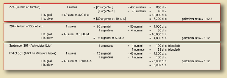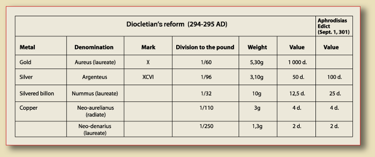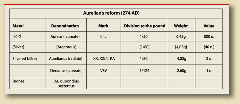We know neither the value of the various coins in relation to each other, nor the price of precious metals. To understand the logic and consistency of Aurelian's reform, it must be put into perspective with the reform introduced by Diocletian some twenty years later.